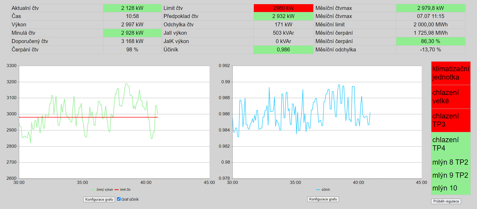 V grafu je možné zobrazit činný výkon, jal.výkon kapacitní, jal. výkon induktivní, limit čtvrthodinový. Pokud zaškrtneme "Graf účiník" zobrazí se graf s průběhem účiníku. Vpravo je zobrazen sloupec s regulačními místy. Zelená barva regulační místo je zapnuto, červená barva - regulační místo je vypnuto. Pod ním je tlačítko "Průběh regulace."